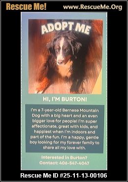 Read more »25-11-13-00106D024Burton (m)(male)Bernese Mountain DogMeagher County, White Sulphur Springs, MTID: 25-11-13-00106