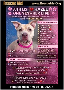 This post is going out with a prayer to fond that one YES for Hazel in time. The NY shelter has been killing so
